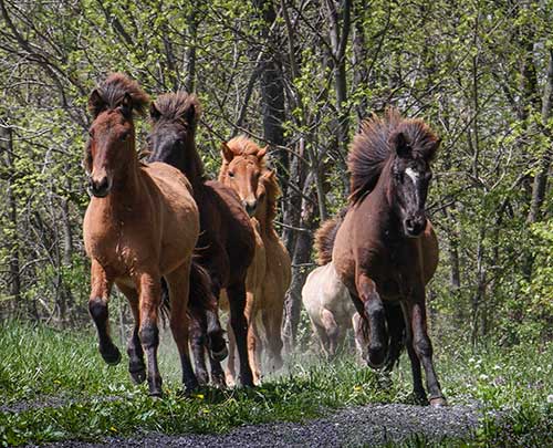 Our farm & horses: Thor Icelandics is a true, working Icelandic horse farm. It is home to about 50 horses of all ages, two cats, and Thor Icelandics' owners. Much of our charm and uniqueness is directly related to our horses. The horses mostly inhabit the area around the barns, which one has to drive directly through the heart of to reach The Hill, Upper- and Lower Tracks. Daily life on any farm involves adventure and unpredictability, so we ask that you remember that certain aspects of farm life are beyond human control. Although we make any and all efforts to ensure a smoothly run event, we cannot fully guarantee that your guests will not be greeted by whinnies of our horses, or that your guests may see a rider(s) on horseback on one of our many trails. Please keep these farm quirks in mind when deciding if Catskill View Weddings & Events at Thor Icelandics is an appropriate site for your event. Our horses are very friendly and curious. If you stop by a field with horses in it, chances are that they will come right over to you. We ask that you and your guests refrain from feeding our horses. And please note that all of our fields include one or two lines of electric fence and it will shock you if touched. So in the efforts of avoiding that you, your guests, and our horses get shocked with a surge of electricity, please refrain from touching the wire fencing and or reaching over- or through it to pet the horses. The horses may also forget about the electric fence in their attempts to talk with you and or be pet. Under no circumstances should you or your guests enter a field with horses in it, unless otherwise permitted and accompanied by a member of the Thor Icelandics staff.